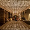 顶做用木质雕花做吊顶装饰,柱体用石材做装饰,墙面用采用暖色调及亮色的砖做装饰,地面和餐区分别采用地砖和地毯铺饰。