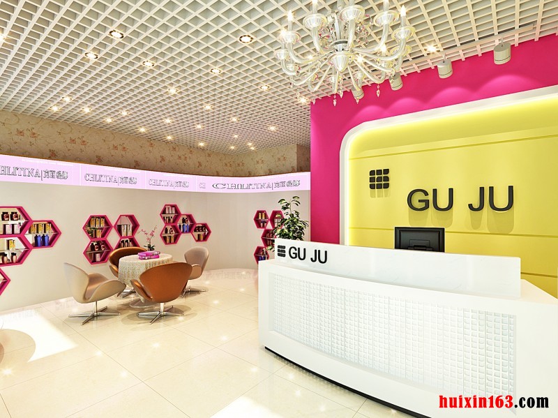 本案的设计风格以简洁为主,利用轮廓清晰的几何图形来划分空间,同时也起到了装饰作用,颜色上采用玫红色搭配黄色,形成鲜明对比,使空间增添了活力彰显了女性魅力;灯光的配置六边形内部的镜面加上地面玻化砖的使用,更拉伸了空间感。弧度墙面的使用,有效的保障了客户的隐私,还可以作为一面产品展示墙,美观的同时,兼备了储物功能。