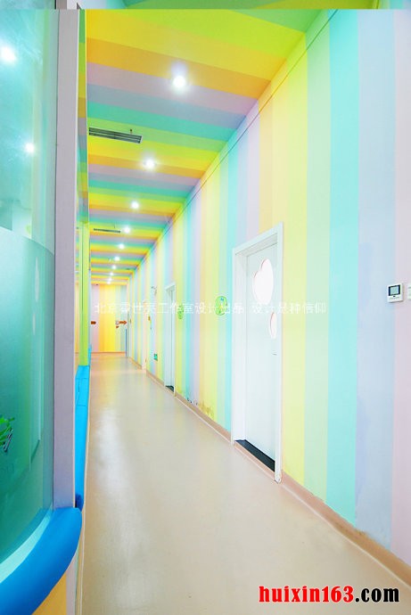 七彩色定为设计主要颜色然后进行局部色彩分支。每个颜色都代表孩子在接受不同的视觉感,不同的视觉组合在一起就变成了一道亮丽的彩虹,也是能体现出团结的力量,走在过道中的孩子就像走在雨后的大地上头顶着彩虹,卫生间墙面用方块拼图,开启小朋友的智慧。