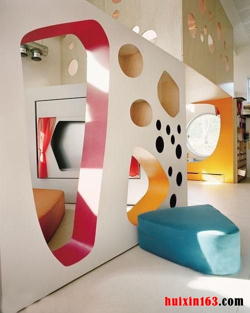 从外到内都采用不规则的造型来打造视觉上的感,洞口充份利用起来,可以做书架、抽屉。稍大的洞口还可以供孩子玩耍,真是一个多功能的设计。