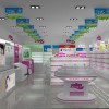 店内的化妆品品牌比较多,所以每个货架上的物品都有一种颜色也是每个品牌的区分,绿色代表着新鲜、清新产品,粉色代表着甜美和优雅的产品,红色代表着奔放和激情的产品。用这种方式来区分场景也是一种设计手法,清晰的表达了场景的分区功能让顾客更加方便的去寻找属于自己类型的产品。