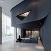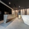 本案原本是上汽集团的六层工业厂房,毫无个性的外观加上不是很合理的空间布局,似乎很难令人与设计产生联想。设计师综合分析,从建筑内外同时着手,赋予建筑一种理性的对话,使其产生一种感性与矛盾的游历性,引人思考。设计分为展厅和办公空间两部分,展厅里不仅设置了玻璃橱窗展示,还设置了隐匿的酒吧区;由于挑高较高,在酒吧区上方设置了一个夹层,作为办公空间,内外两部分通过一道黑色的曲面墙体分隔,使其不是那么单调突兀。展厅另一侧是由413跟半透明的PVC管件构成的半通透曲面帘幕蜿蜒在展厅空间之中,与外立面玻璃幕相互观照,若即若离,不经意间构筑了几个对外场景展示。实与虚、黑与白、动与静的对话在整个空间的中性灰色基调中更具戏剧性,并有效地烘托了石材展示品的天然色彩和纹理。橱窗的展示很是奇妙,类似一个镜面,在阳光的照射下,映衬出外界的景象,是整个空间一个亮点。