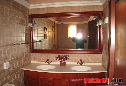 在卫生间的墙面上可以采用较普通的一些小块的瓷砖的装饰,但是在盥洗台和梳妆镜的设计上可以采用非常鲜亮的红色,在盥洗台的柜门上装饰了非常漂亮的一些精美的浮雕,在盥洗台的台子上面还有两个铸铜的水龙头,中间是一个漂亮的小花盆也是和水龙头同样的造型,首先在色彩上就形成了一种新奇的统一,在镜子的两边还有两个小巧的壁灯,这样的设计给人一种亲切的田园美感。