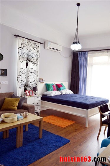 一簇吊灯的造型,特别的可爱,看着特别的接地气,还有一定的艺术的气息。吊灯的下面的床的布置非常的干净利落,没有那种将床包裹的严严实实,甚至连床腿都看不清楚的装扮。简单的一张床垫,铺在上面,下面裸露出床体本身的颜色,以及床的下面的地板的颜色,宣扬的是一种最平凡最朴实的生活。床头桌的后面装饰的一幅大大的花卉的素净的图画。在床的下面是一个小小的橘色的垫子,为房间增添了一些色彩。蓝色的毛毯上面并排放着两个农家小院的小方桌,摆放一个褐色的沙发,房间里面充满了自然的气息。