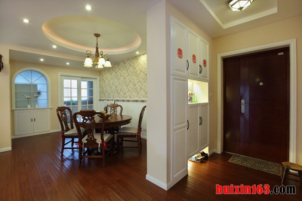 从大门一进入,最新映入眼帘的是页面整齐的柜子,柜体的设计直通房顶,而且在柜子中间的位置和下面的空间里有两个贯通的设计。这样在客人进入一个房间的时候,并不能一下子看到房间的全貌,但是透过柜子,也能够豹窥一斑,了解一个大致的情形。当然不能够把空间隔绝开来,所以只有面墙做成了隔断的设计,另外的半面是开放的,这些柜子就成了家里面的屏风,既有实际的存储的效果也有一定的装饰的效果。在门口的上方的房顶上,有一个方形的内凹的区域,安装了一个六角形的顶灯,对应的在房间的主体部分的房顶上有一个圆形的内凹的区域,在上面悬挂下来一个枝形吊灯,在圆形的区域的周遭有一些射灯的设计,就像是众星拱月的设计。
