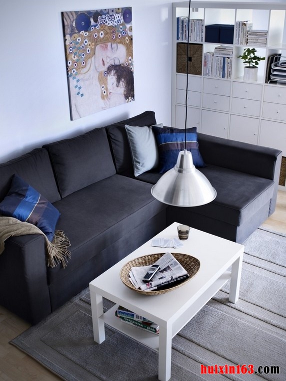 整齐的就像是雕刻的花纹一样的地毯,简洁硬朗的线条,搭配一个白色的双层的木桌,木桌的上面摆放一些经常读的杂志和报纸,从房顶上面垂下来一个低矮的吊灯,银色的灯罩,有一种高雅文艺的气息。黑色的转角沙发,不论是坐着还是躺着都是特别的舒服惬意。沙发的上面张贴着一张风格现代的油画。靠近沙发转角的位置放一个简洁美丽的书架,书柜的细面是整齐的抽屉和柜子的空间,在上面方方正正的格子里面摆满了书和植物,不仅整洁有序,而且有很好的观赏性。如果有一些不经常用到的小的饰品,就放在一个收纳盒里,整齐的摆放在书架的空格里。