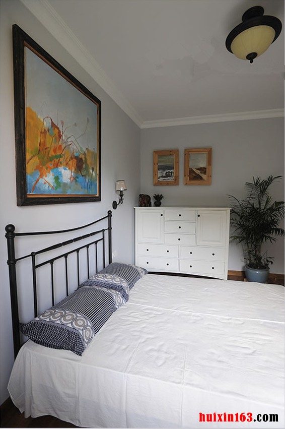 在卧室的顶面上还装饰了非常漂亮的石膏线条的顶角,在顶面上的蜡黄色的吸顶灯也能够让整体的空间变得更加的唯美和舒心雅致。铁艺的一张小床的床头的上方还有装饰着靓丽的色彩的涂抹着的漂亮的彩画,用色彩表达出我们的思想和我们的心情。在墙面上装饰着的漂亮的原木色的边框里面的风格清秀的图画,在米白色的抽屉柜旁边的高大的绿色的盆栽,都在用各种不同的表达风格装饰出唯美和优雅自然的家装装饰效果。