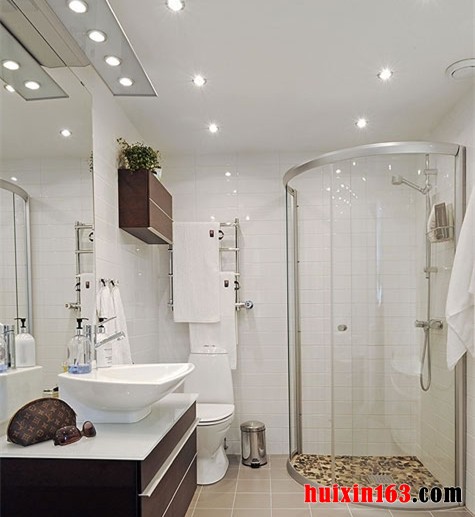卫生间的照明完全一览与顶面上的射灯,在盥洗池的正上方,射灯的光线更加的集中,营造出一个明亮的现代化的居室氛围。在墙面上设计的小巧的吊柜,完全是为了烘托出来简约舒适的空间氛围。在墙角的位置用玻璃门打造了相对隔离的淋浴区,空间不大,功能齐全,而且带给人非常舒适和别致的居家的感受。在墙面上的众多的置物架,让毛巾等杂物也都变得规整。
