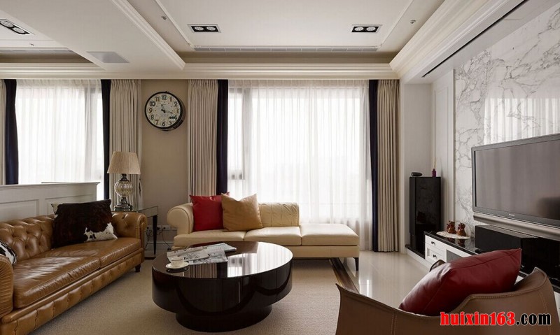 客厅空间内的装饰带给我们的第一感觉是非常整齐、干净,空间内的装饰色调是以白色为主,整体的装饰布局也非常有秩序,不会令我们感觉过于杂乱,空间内石膏板吊顶上采用了平顶式的造型设计,虽然设计简约但也并不会令我们感觉过于单调,因为四周的夹层设计可以使整个空间都显得非常具有层次感,电视背景墙上采用了大理石材质做装饰,可以提升整个空间的装饰档次,同时也能够彰显出一丝别致的美感。