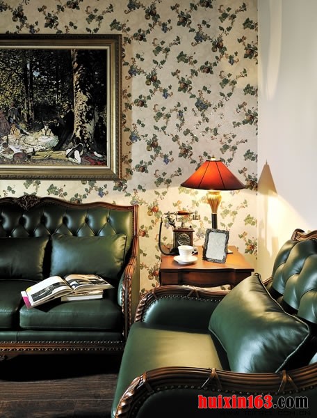 豆绿色的真皮沙发,厚实宽大的实木的框架上装饰满了漂亮的精致的花纹,能够呈现出非常优雅和自在唯美的生活的追去。在墙面上装饰着漂亮的绿色的碎花图案,是一种非常清新和健康的背景。在墙面上还装饰了漂亮的一幅森林中的野炊的油画,将我们的思绪引入到更加的旷远的自然之中,用优雅作为田园风格设计的主基调。