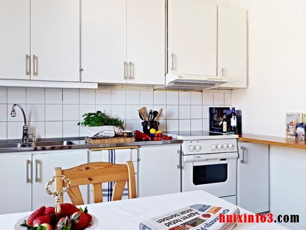 同样的白色的布局,换一个不同的小特色,就能起到画龙点睛的作用,在房间里面增添一些实木的元素,让厨房的布局给人的感觉更加的清新。一个白色的餐桌的上面摆放一盆鲜红的草莓,和操作台上面的新鲜的蔬菜起到同样的装饰房间色彩的作用。