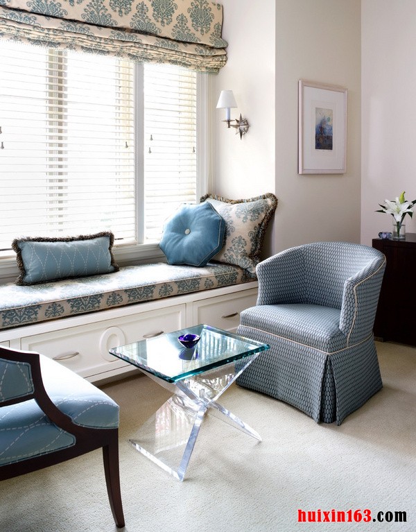 淡蓝色的装饰最适合平复一个人的情绪,在这样的颜色的点缀下,你将会拥有舒缓的心情,更放松的身心,慢慢的享受在家里面每一分每一秒悠闲的时光。在白色的窗子上面安装白色的百叶窗,能够营造出一种简洁的装饰的效果。在窗子的下面的区域布置一个休息区,使用带有浅蓝色的花纹装饰的坐垫和枕头,同时使用相同材质的窗帘,让整个窗子都显得非常的清幽淡雅。在休息区的旁边摆放一个透明底座,玻璃桌面的方桌,两张具有蓝色色调的额沙发和椅子,这里就是一个特别好的家人交流的场所。
