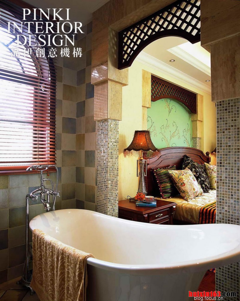 在浴室和卧室之间的门洞上面设计一个木制的楼刻板制作的拱门造型的垭口搭配马赛克装饰的方形的门柱,材质之间的对比非常的强烈,同时两者之间的组合没有任何的违和感,镂刻拱门的造型搭配方柱的造型在卧室床头背景墙上也得到了再一次的重复,整个空间的整体性非常强。