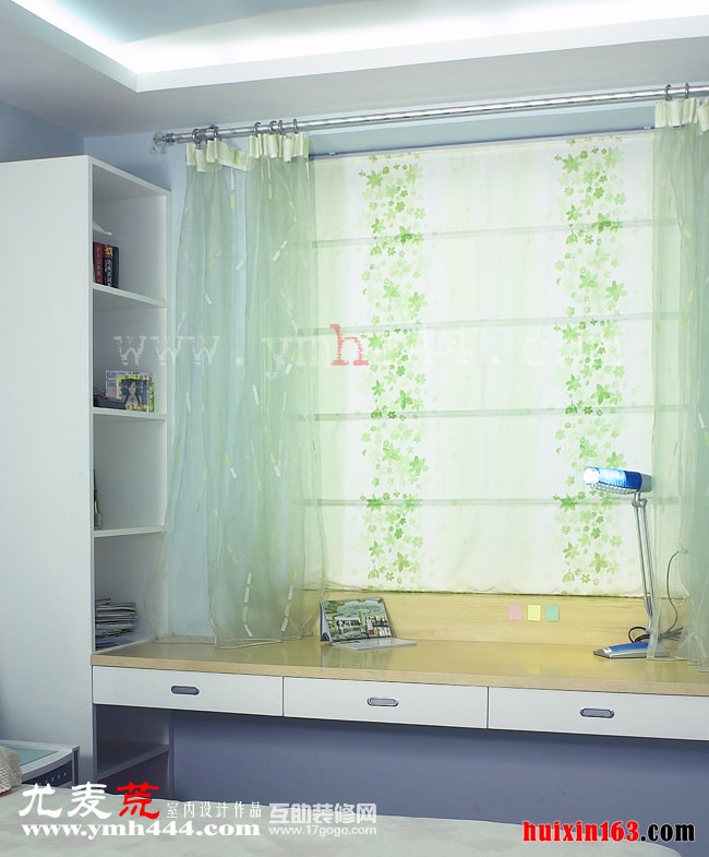 飘窗上面采用淡绿色的窗纱,飘窗的两边是整齐漂亮的格子,在窗台的位置延伸出来一个原木色带有白色抽屉的桌面,一个简约使用的书桌兼功能齐全的书架就全都齐备了。
