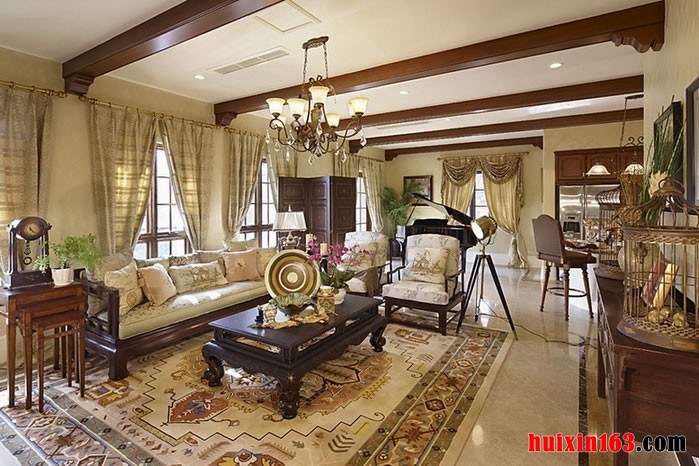 在客厅的顶面上采用几根深色的假木梁作为吊顶的主要形式,让空间的结构多了一些复古和田园的气息。