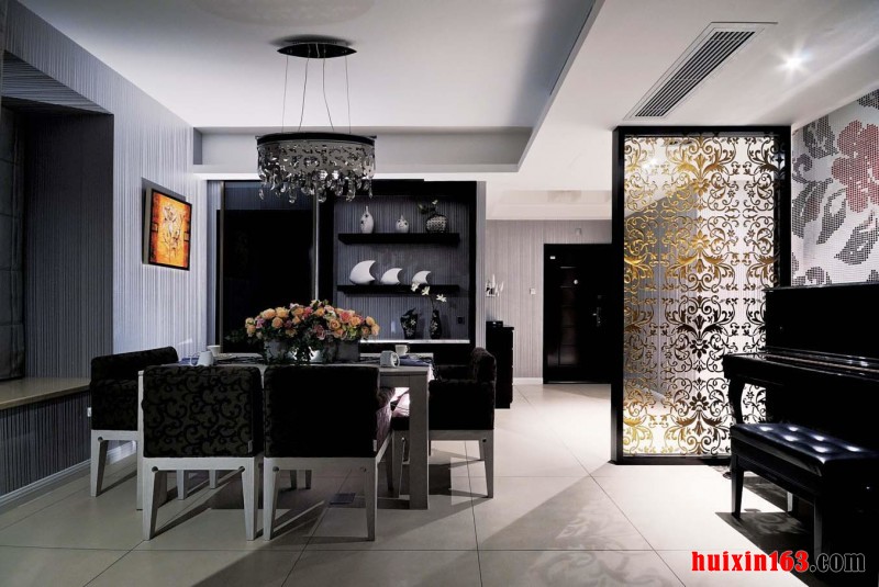 造型简单别致的吊顶,搭配顶面上黑色的水晶灯,在餐厅和过道之间的玻璃隔断上面是优雅华丽的欧式花纹的装饰,带给人非常典雅唯美的视觉感受。