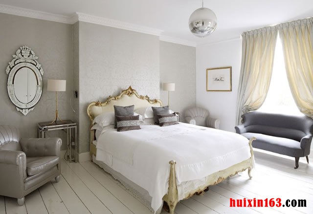 欧式的双人床上面具有金色的边线,在床的上方悬挂着一个玻璃的球灯,在墙面上是浅灰色的壁纸,地面上是整齐的灰白色的地板,营造出一排素雅淡然的空间氛围。在靠近窗子的位置摆放着一个优雅的休闲沙发,在墙面上是圆形的镜面,打造出一个舒适优雅的居住空间。
