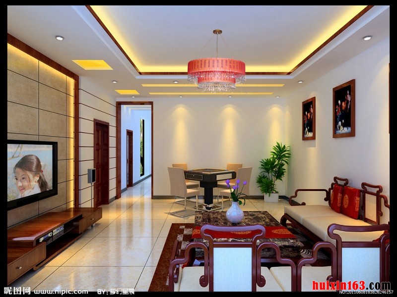 在影视墙上面采用浅黄色的瓷砖拼接出非常整齐的线条,同时在墙面的周边装饰上实木的线条,在线条的里面是一圈明亮的灯带,灯带的设计和顶面的一圈明亮的灯带是相呼应的,中式的家居和两层的粉色的月亮水晶灯也搭配出非常优雅和时尚的感觉。