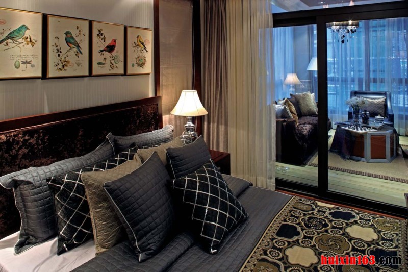在比较质朴沉着的双人床上面搭配的也是比较深色的富有神韵格调的床品,在床头背景墙上面的几幅优雅并且颜色艳丽,神态传神的几幅小的花鸟画,为空间增添了灵动和艺术的气息。