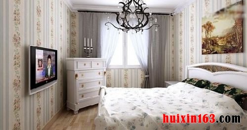 在卧室的墙面上的条纹状的壁纸上面夹杂着一些温婉华贵的花朵的图案,床头背景墙上是一幅画面布局异常唯美的乡村的图景,营造出非常浪漫和唯美的气息。