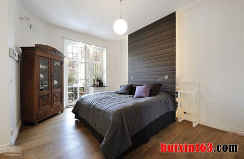 在卧室的床头背景墙上是一面非常整齐的深色的条纹的壁纸,和周边白色的墙面形成了鲜明的对比,在靠墙的位置还摆放了一个样式古朴的衣橱,带给人一种深沉大气的装饰感受。