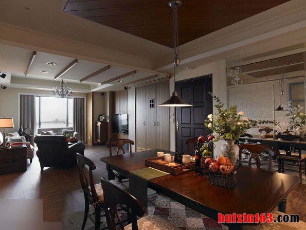 在客厅的顶面上是几道整齐的横梁,在横梁中间则是一些漂亮的射灯,在顶面上还有一盏漂亮的水晶灯,在房间的地面上采用质地比较粗的通体砖铺设,在一个深色的实木的餐桌的正上方一盏漂亮的扁形的吊灯带给人绝对优雅和浪漫的感受。
