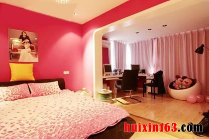 卧室通过垭口分割成两个空间,卧室空间里面主要是粉色的装饰,在书房里面主要是白色和红色的墙面,在靠窗子的位置是一个简约风格的宽大的书桌,搭配黑色的办公椅,黑白之间鲜明的对比彰显出装饰的格调。