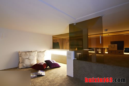 在房间的一个角落里面,通过摆设一些大大小小的靠枕,营造出一个舒适的休闲的角落,在空间之中还采用浅灰色的玻璃墙作为空间的分割,还有一些时尚的感觉。