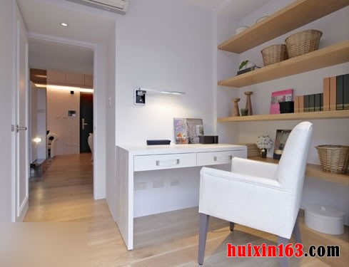 白色的简约风格的书桌正对着其中的一面墙,而和另一面墙隔开了一段的距离,在墙面上设计了一些漂亮清新的隔板,在上面,自己喜欢的图书和收藏的一些杂物都找到了他们应有的空间。