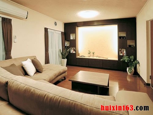 在客厅的电视背景墙的设计上是一面墙的超大的柜子,在周边都是一些造型整洁别致的深色的柜体,中央的电视背景墙上还有明亮的灯光的设计,带给人非常温馨和典雅的装饰效果。米黄色的沙发搭配小方桌的设计,也让空间多了一丝轻松和惬意的氛围。