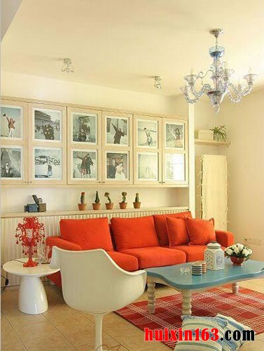 在沙发的后面也是一整排的暖气片,在暖气片上面建造了一层隔板,用来摆放小的盆栽,上面的两层吊柜的柜门上面则是各种图片,也是一个非常清新独特的照片墙。