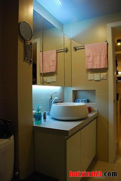 在卫生间的洗脸台上面的白色的陶瓷的脸盘呈现出正圆的格局,墙面上的镜子直通墙面的边缘,这种精确的装饰,也彰显出现代人生活的理性。