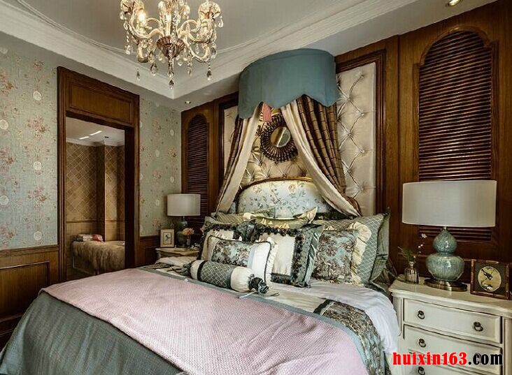 卧室的设计依然是以舒适为主,纯棉布艺搭配上纯正的色彩可以带给人们一种舒适感,水晶吊灯的点缀则使空间多一丝亮点,也适当的活跃了空间装饰的气氛,墙壁上的碎花壁纸的衬托可以使空间充满浪漫色彩,零星的点缀也会为空间装饰增添一种新的生机。