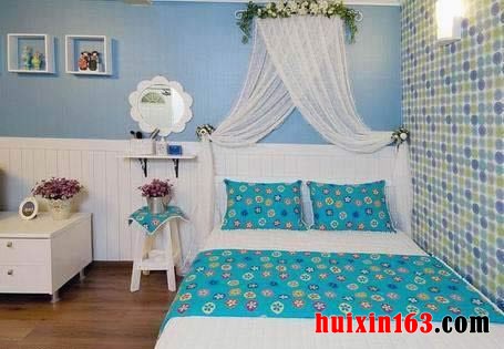 一个小巧精致的双人床上面是绿色背景,简洁的如童话一般的碎花图案的床品,墙面上是蓝色和白色对比分剖的场景,床头的纱幔上面还有清新的花朵的装饰,就像是一个大自然的精灵居住的房子。