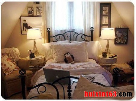 铁艺的床架一定要有优美的花朵般的图案,墙面上展示几个漂亮的明星的图案,也没有什么不好的,在床头的两边是两个圆形桌面的床头柜,在柜子的上面是两盏漂亮清新的小台灯,桌边甚至还有沙发,生活好像是严密而且随意的。
