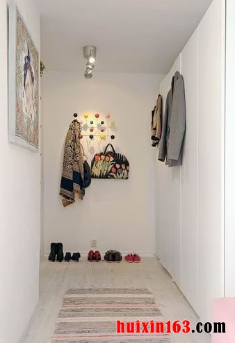 在过道的顶面上只有一盏轨道的射灯,其中的一面墙靠立着一个白色的大衣柜,和墙面组合成一种非常贴合的视觉效果。在过道转角的位置,墙面上的挂钩也呈现出各种的色彩,让人感觉非常的鲜亮和活泼。