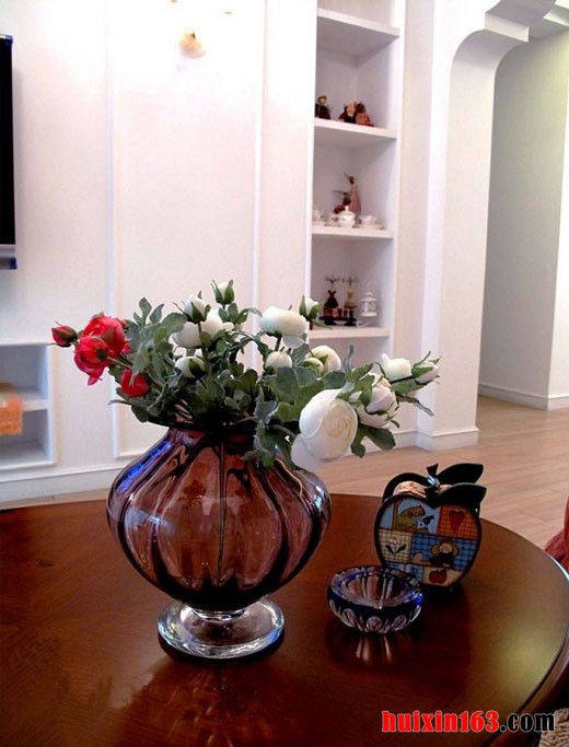 白色的墙面上有时候不需要太多的粉饰,只要在墙面上凿开安装几个漂亮的格子就好了,在地面上就是原木色的地板,深色的圆形的餐桌,搭配上琉璃的花瓶,比较容易打造出这种经典奢华的场景。