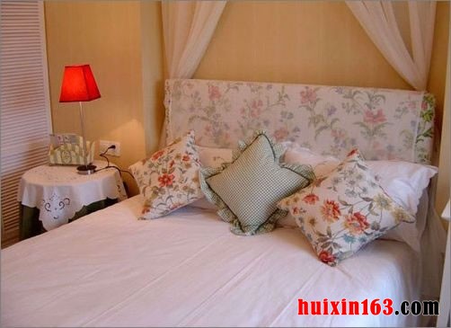 另一个房间的双人床的旁边的圆形的床头柜上面具有一个红色灯罩的台灯,高耸的床头上面是非常清新和宁雅的花卉的图案,让人感到非常的放松和自在。