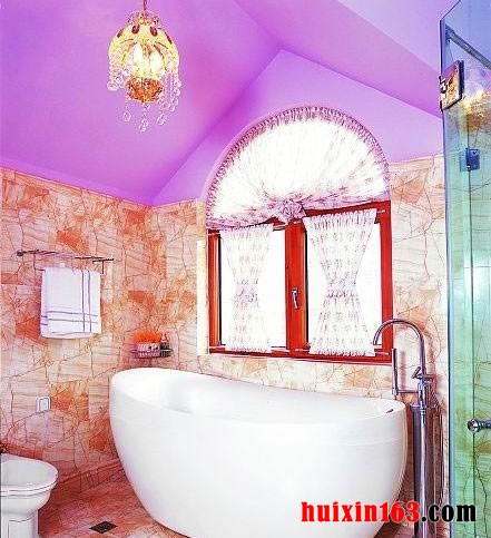 在卫生间的顶面上是一个紫色的尖顶,墙面上是呈现出最自然的撕裂纹的壁纸,营造出非常清新和别致的家居感受,一个巨大的白色的浴缸,也让人感觉到非常放松和清爽的姿态。