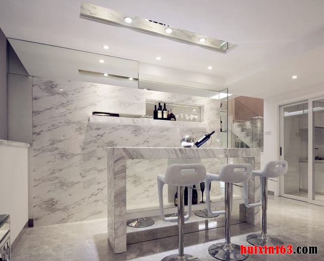 吧台设计一定是空间装饰的一大亮点,这也是十分吸引年轻人的一个设计空间内的装饰色调仍然延续了白色主题吧台以及后面的装饰墙壁都使用了人造石做装饰,整体可以营造出一种高贵感,同时也可以将简约主题展现出来。