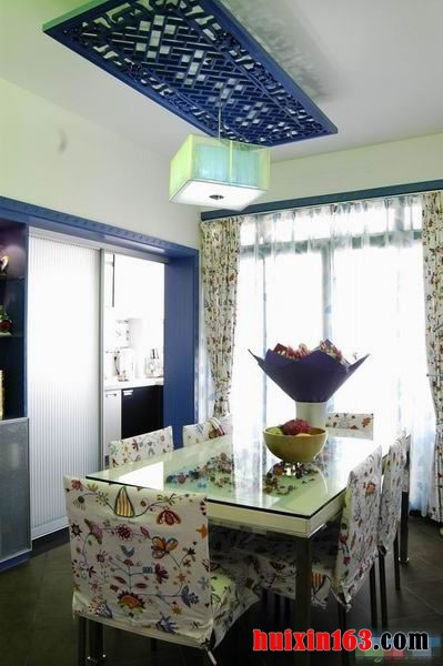 在地面上铺设的瓷砖呈现出一些青灰的色调,玻璃的餐桌搭配着呈现出浓艳的春天景色的餐椅,顶面上是一盏四方形的吊灯,整个餐厅的布局让人感觉到清爽和宜人。