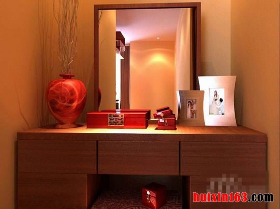 深色的实木的化妆桌的抽屉上面没有任何的把手,单纯靠设计就能够设计出非常方便开合的抽屉,下面的柜子的柜门也是同样的处理。在桌面上还有一个红色的小花瓶,花瓶里面则是一些干枯的植草,这是一种非常甜美的表现。